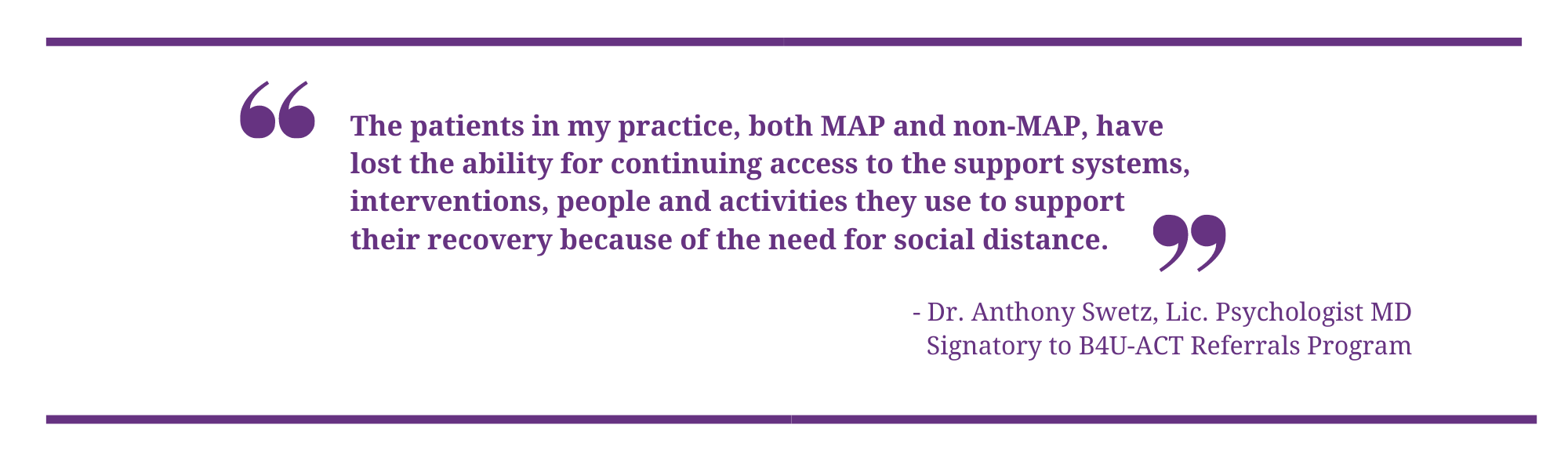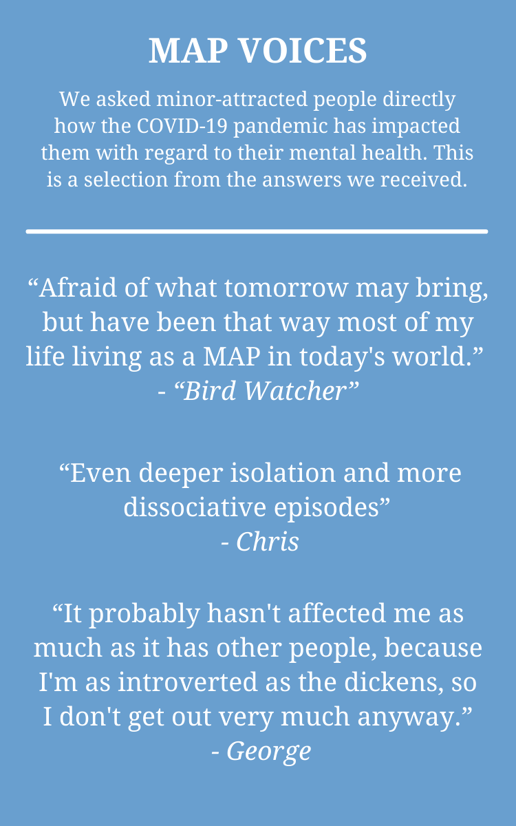 MAPs who seek mental health services want to be treated like any other client and receive assistance to meet their needs, rather than to devise strategies to protect other people from them. Like other clients, most MAPs we have met do not have difficulty refraining from abusing children, but seek help dealing with the results of stigma and marginalization, such as self-hatred, depression, anxiety, suicidal feelings, lack of intimacy or sexual outlet, perceiving a need to live a double life, and feelings of alienation from society, friends, and family. In addition, like other clients, they may seek help dealing with issues unrelated to their attractions, but still want to be open about their sexuality.