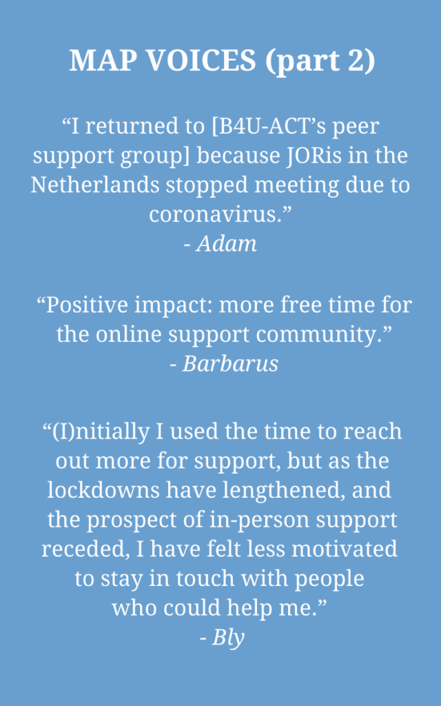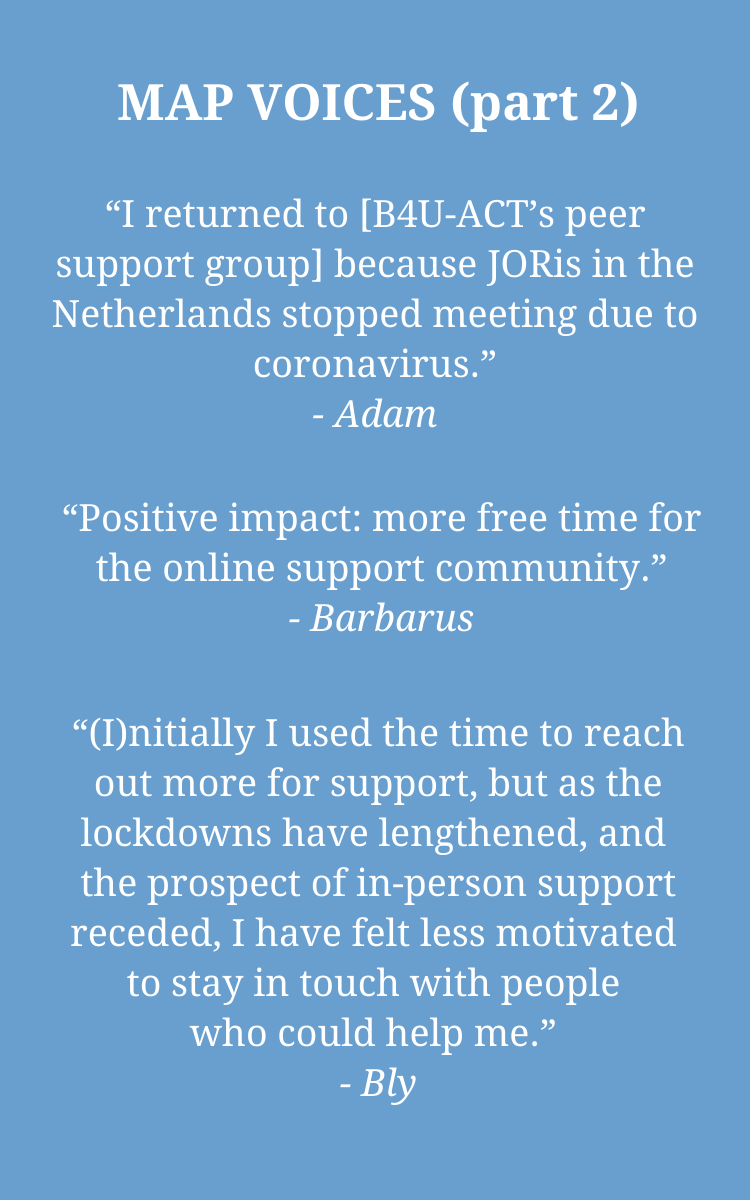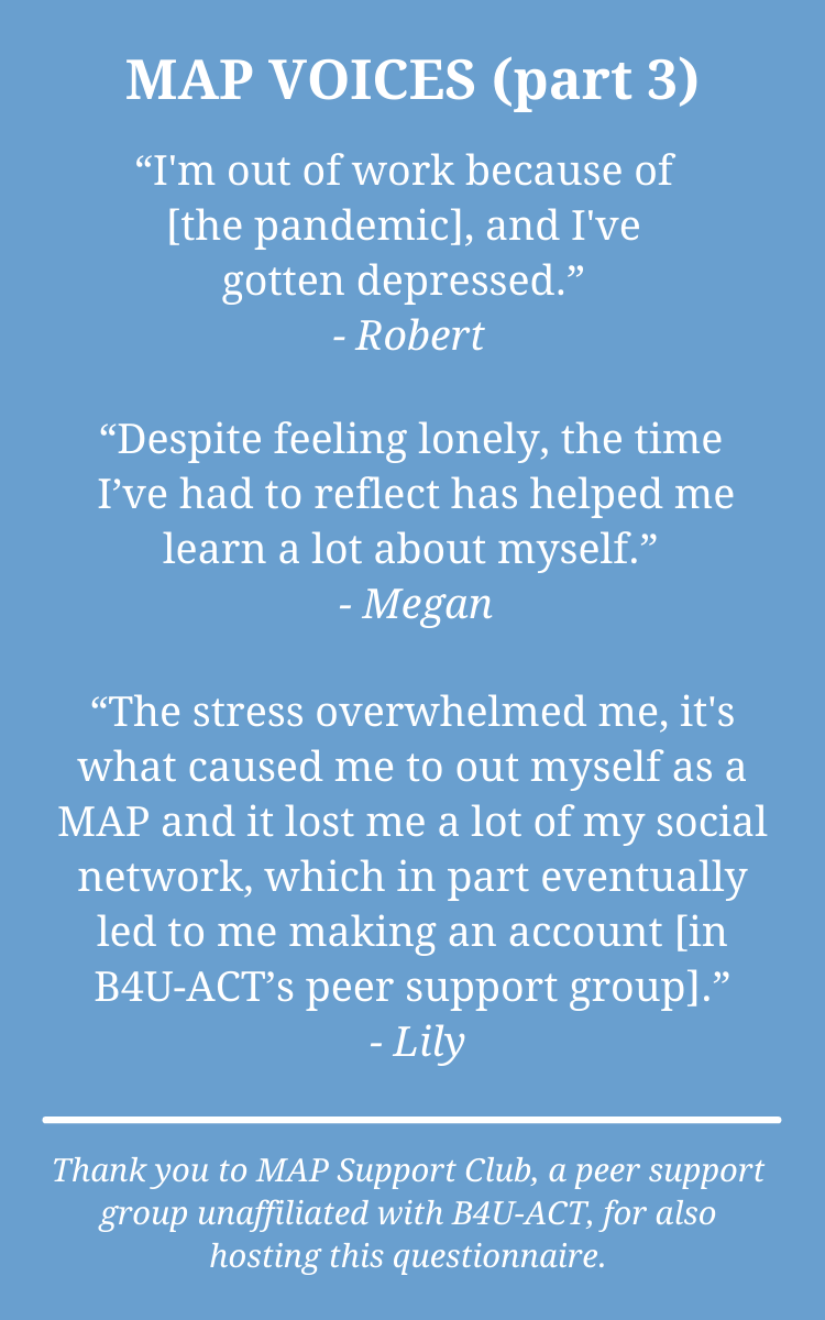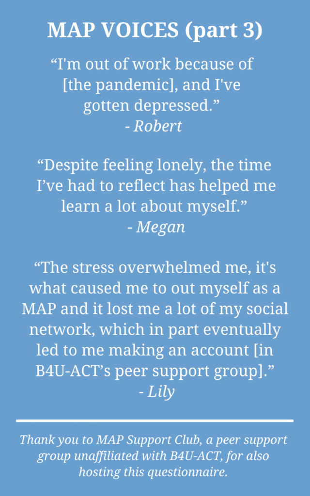 Compounding this, many MAPs are aware of the treatment methods that historically have been used coercively on sexual minorities as a result of such a social-control approach. These include being forced to self-identify as dangerous and incurably “deviant,” to submit to phallometry (a procedure often seen as degrading and stigmatizing, whereby a device is connected to the penis to measure erection while the person is subjected to sexual images or audio recordings), and to repeatedly undergo some kind of arousal reconditioning method such as aversion therapy or covert sensitization to associate fear or revulsion with their sexuality. MAPs are aware that similar methods have been used in modern times on MAPs, typically under coercion, including on young adolescents (one of whom attended a B4U-ACT workshop as a young adult), and have reportedly led to severe trauma and other psychiatric problems. MAPs may fear that researchers and therapists will approve of the use of such methods on them.