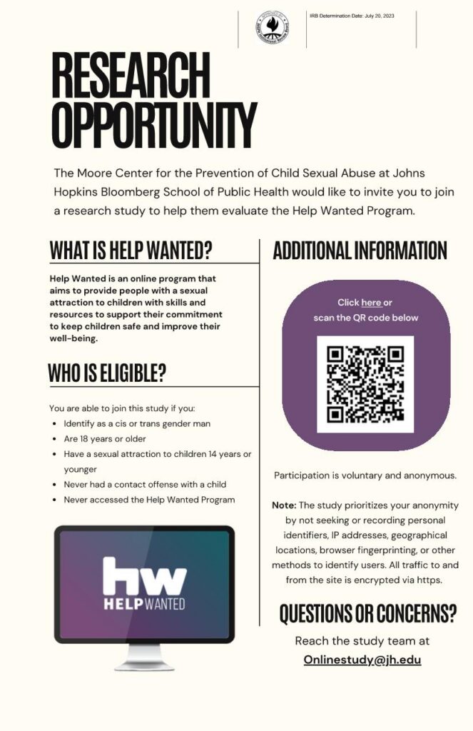 People who are age 18 or older and identify as being attracted to minors are invited to participate by completing a 15-minute survey. The survey is available in both English and German. Interested potential participants can learn more or complete the survey using the following link: