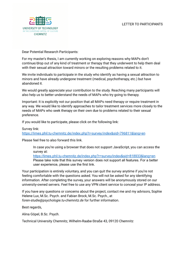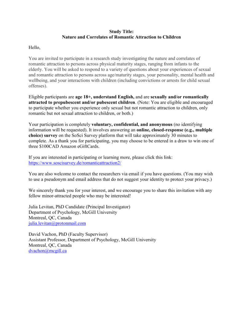 Participation involves completing a 20–30 minute survey. The survey is offered as an English translation from the researcher’s original French, but may be made available in other languages if needed. Anyone who identifies as being attracted to minors is eligible to participate.