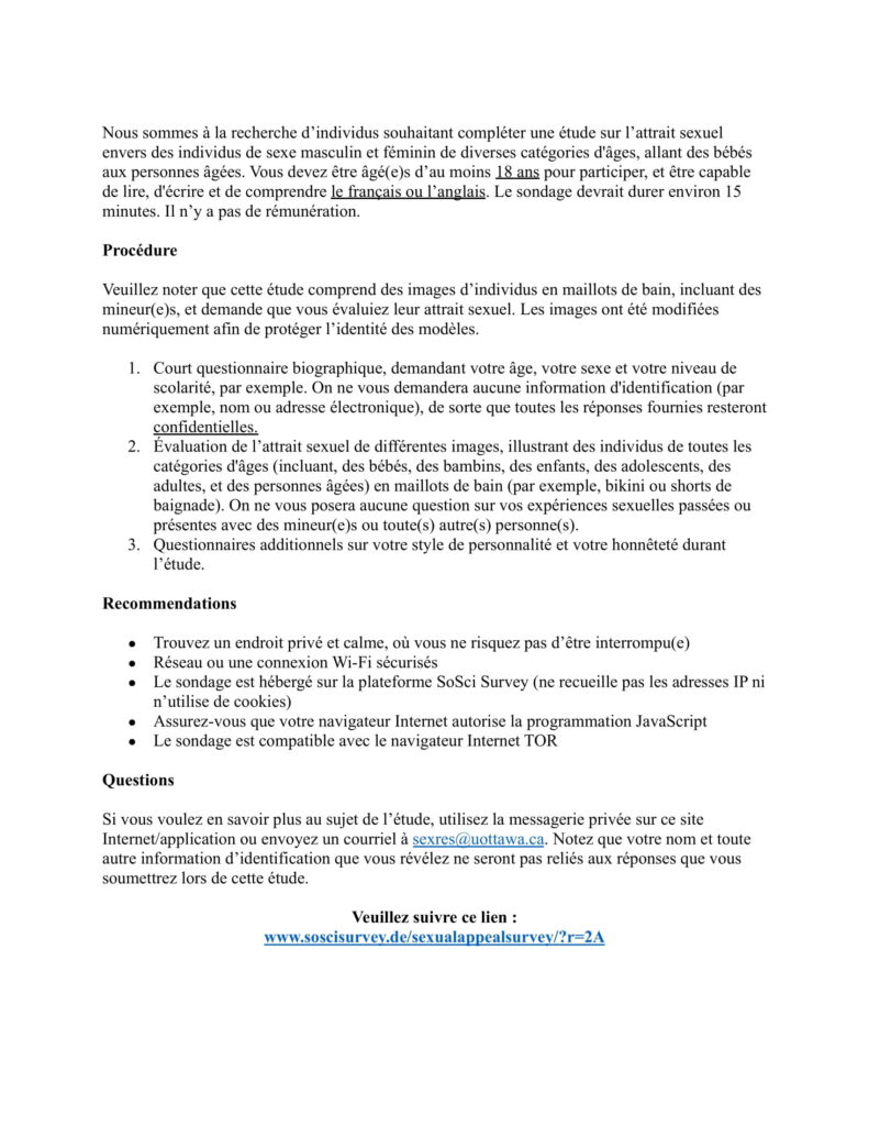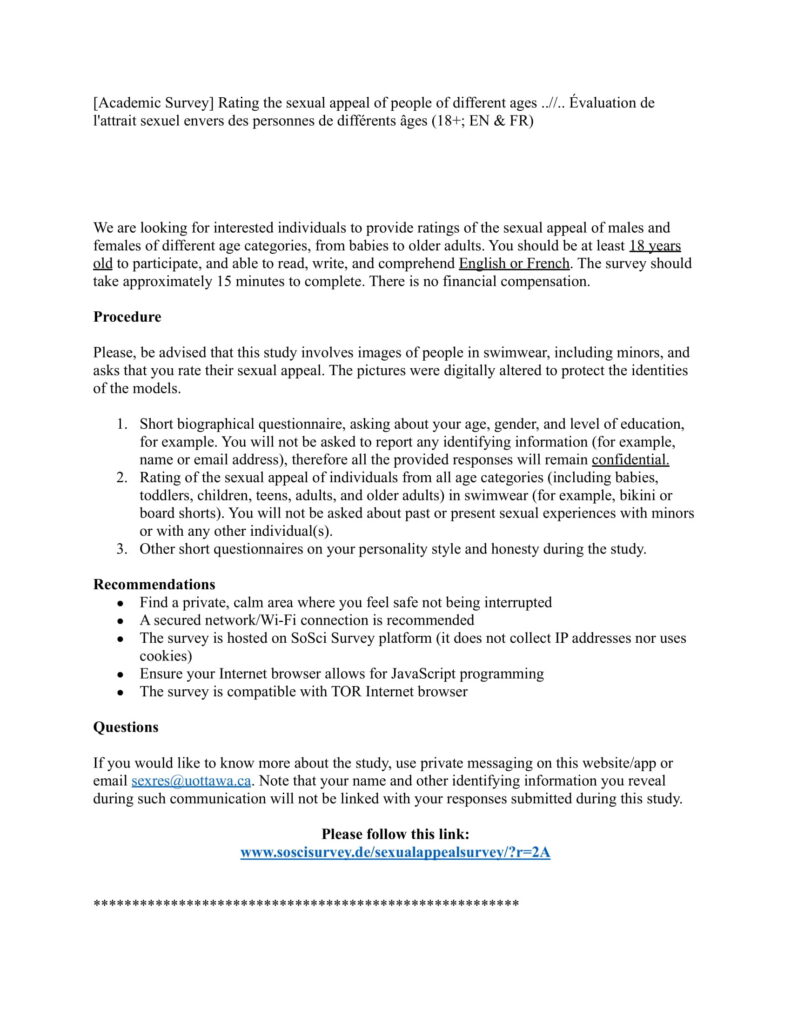 Participation involves completing an anonymous 45-minute survey, and people who are age 18 and older and identify as having at least some attraction to children 14 or younger are eligible to participate.