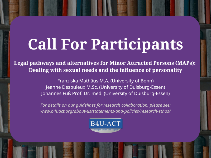 People who are age 18 or older and identify as being attracted to minors are invited to participate by completing a 15-minute survey. The survey is available in both English and German. Interested potential participants can learn more or complete the survey using the following link: